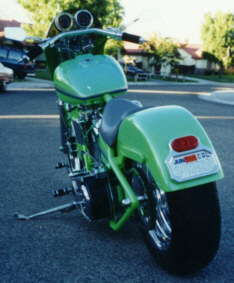 Rigid frame, 200 Series rear tire, 3" open primary... this bike was built for speed. The Sputhe motor's internals are top secret. The tin has been repainted red since these pictures were taken. The original green was an experimental House of Kolor shade that didn't like the sun.